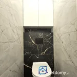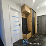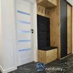 W przedpokoju znajduje się praktyczne siedzisko oraz pojemna szafa na wymiar, dzięki którym łatwo utrzymać porządek i schować okrycia wierzchnie, buty czy akcesoria domowe.