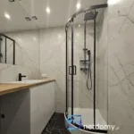 W salonie zastosowano modne lamele drewniane i winylową tapetę podświetloną listwami led, co nadaje wnętrzu przytulny, a jednocześnie nowoczesny charakter. Na podłogach położono wysokiej jakości panele oraz terakotę, łatwe w utrzymaniu i odporne na codzienne użytkowanie. Łazienka wyposażona jest w kabinę prysznicową oraz miejsce na dużą pralkę, a w osobnym WC zamontowano nowoczesny zestaw podtynkowy.