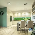 Kuchnia została wykonana na wymiar i w pełni wyposażona w sprzęt AGD. Do dyspozycji masz nowoczesną płytę indukcyjną, piekarnik, mikrofalówkę, zmywarkę, lodówkę oraz okap. Dzięki temu gotowanie jest wygodne, a liczne szafki zapewniają dużo miejsca do przechowywania naczyń i produktów.