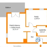 W skład mieszkania wchodzi jasny salon z wyjściem na duży balkon, aneks kuchenny w zabudowie, przytulna sypialnia, komfortowa łazienka oraz funkcjonalny hol z szafami w zabudowie. Układ pomieszczeń został zaprojektowany tak, aby maksymalnie wykorzystać przestrzeń i ułatwić codzienne życie.