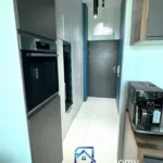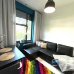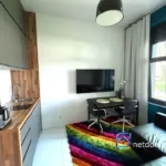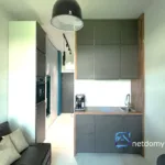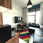 Wnętrze mieszkania zostało urządzone w formie mikroapartamentu, gdzie każdy centymetr przestrzeni został odpowiednio przemyślany. W części dziennej znajduje się miejsce zarówno do odpoczynku, jak i pracy, a kompaktowa kuchnia w zabudowie została wyposażona w najważniejsze sprzęty AGD – zmywarkę, piekarnik, płytę grzewczą czy małą lodówkę. Dzięki temu mieszkanie jest gotowe do natychmiastowego użytkowania lub wynajmu. Duże okno zapewnia dostęp naturalnego światła, co sprawia, że lokal jest optycznie większy i bardziej komfortowy.