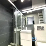 Łazienka została urządzona praktycznie i nowocześnie. Znajduje się tu prysznic oraz miejsce na przechowywanie podstawowych rzeczy. Aranżacja sprawia, że mimo niewielkiej powierzchni wnętrze jest wygodne w codziennym użytkowaniu. Całe mieszkanie sprawia wrażenie spójnego, zadbanego i dobrze przemyślanego – idealnie odpowiada potrzebom współczesnej osoby mieszkającej sama.