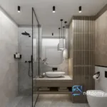 Łazienka daje możliwość dowolnej aranżacji zgodnie z najnowszymi trendami – mieści się w niej zarówno część prysznicowa, jak i miejsce na praktyczne szafki. Całość można wykończyć materiałami o wysokiej jakości, co szczególnie docenią osoby oczekujące nowoczesnego stylu i wygody.