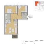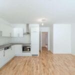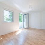 - Salon z aneksem kuchennym – otwarta przestrzeń z dużymi oknami, zapewniającymi dużo światła. W pełni wyposażona kuchnia (zmywarka, piekarnik, płyta indukcyjna, lodówka).