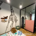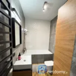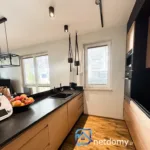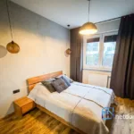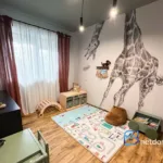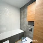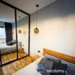 W strefie prywatnej znajdują się dwie ustawne sypialnie – główna (ok. 11,96 m²) z dużym łóżkiem i pojemnymi szafami oraz pokój (ok. 11,59 m²), który świetnie sprawdzi się jako sypialnia dziecka, gabinet lub pokój gościnny. Łazienka (ok. 4,81 m²) została wykończona w nowoczesnym standardzie i wyposażona w dużą wannę. Praktycznym uzupełnieniem jest wydzielona garderoba/pralnia z pralko‑suszarką i systemem przechowywania. Wnętrze wykończono panelami winylowymi, naturalnym fornirem, elementami z prawdziwej cegły oraz betonem architektonicznym – spójnie, ponadczasowo i solidnie.