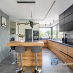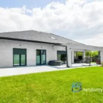 Program funkcjonalny zaprojektowano na jednym poziomie. Serce domu stanowi jasny salon z jadalnią i kuchnią, z wyjściem na częściowo zadaszony taras. Kuchnia wykonana na wymiar, ze spiżarnią, ułatwia codzienną organizację. Strefę prywatną tworzy apartament małżeński z własną garderobą i łazienką, druga sypialnia z garderobą oraz dwa dodatkowe pokoje/gabinety – rozwiązanie, które pozwala dopasować przestrzeń do rytmu życia rodziny. Dla wygody domowników przewidziano pokój kąpielowy, osobne WC przy strefie dziennej, praktyczną pralnię oraz pomieszczenie techniczne. W bryle budynku mieści się garaż dwustanowiskowy z bramą sterowaną zdalnie – wejście „suchą stopą” docenisz o każdej porze roku.