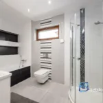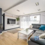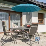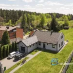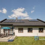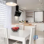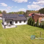 Dom wzniesiono z pustaka ceramicznego Porotherm, a dach pokryto dachówką ceramiczną – to trwałe i sprawdzone materiały. Okna PCV wyposażono w rolety zewnętrzne, wejście podkreślają drzwi o podwyższonym standardzie bezpieczeństwa. Ogrzewanie stanowi kocioł gazowy dwufunkcyjny; w kuchni, salonie, łazience i holu zamontowano ogrzewanie podłogowe, w pozostałych pokojach – grzejniki konwektorowe. Komfort użytkowania podnoszą instalacje fotowoltaiczne oraz solary do podgrzewania wody, co ogranicza koszty eksploatacji i wpisuje dom w trend rozwiązań proekologicznych.