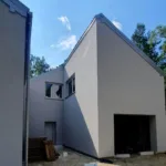 Budynek realizowany jest w standardzie deweloperskim – z nową stolarką okienną PCV, ociepleniem i elewacją, bramą garażową oraz niezbędnymi instalacjami. Przewidziano ogrzewanie w formie pompy ciepła oraz możliwość zasilania gazowego; dodatkowo dostępna jest „siła”. Woda z miejskiego wodociągu, a gospodarka ściekowa obecnie w oparciu o szambo (z docelowym podłączeniem do kanalizacji – po jej wybudowaniu zbiornik może służyć do retencji deszczówki). Takie rozwiązania dają elastyczność i wpływ na końcowy standard energetyczny domu.