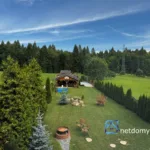Teren jest płaski, o kształcie prostokąta, ogrodzony i zadbany – trawniki, nasadzenia, miejsce na rekreację. Do posesji prowadzi wygodny dojazd, a wolnostojący garaż uzupełnia komfort parkowania. Okolica to luźna zabudowa jednorodzinna, lasy i tereny spacerowe – idealne warunki do odpoczynku po pracy.