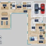 Przestrzeń rozplanowano praktycznie: strefę dzienną tworzy salon z jadalnią i kuchnią (ok. 60,6 m²), z wyjściem do ogrodu. W części prywatnej przewidziano trzy sypialnie (w tym master z garderobą 15,21 + 6,52 m²), pokój kąpielowy (ok. 11,6 m²) oraz dodatkowe WC (ok. 3,6 m²). Program uzupełniają kotłownia/pom. techniczne oraz garaż na dwa auta – przejście suchą stopą do domu ułatwia codzienną logistykę. Wszystkie pomieszczenia znajdują się na jednym poziomie, co podnosi komfort użytkowania i ułatwia aranżację.