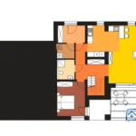 Na parterze zaplanowano wiatrołap, pomieszczenie gospodarcze, łazienkę z WC oraz strefę dzienną: aneks kuchenny połączony z jasnym salonem, z miejscem na duży stół i wygodną część wypoczynkową. Dodatkowy pokój na tym poziomie sprawdzi się jako sypialnia gościnna albo wygodne biuro do pracy zdalnej. Piętro tworzą trzy ustawne sypialnie, łazienka, garderoba i komunikacja. Układ pomieszczeń został przemyślany z myślą o codziennej wygodzie rodziny.