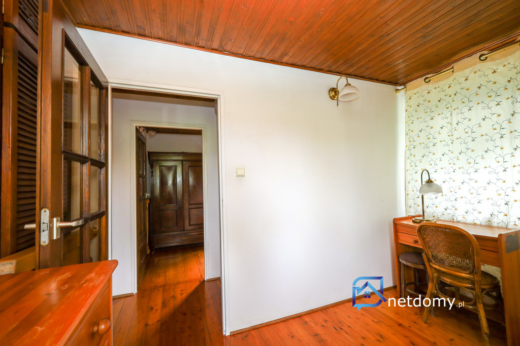 Na parterze znajduje się przestronny pokój dzienny z kominkiem oraz wyjściem na taras i ogród, kuchnia z pełnym wyposażeniem i zabytkową kuchnią kaflową, a także dodatkowe pomieszczenia gospodarcze, spiżarnia, pralnia oraz WC. Piętro oferuje trzy sypialnie, łazienkę, korytarz oraz strych użytkowy, który może zostać zaadaptowany na dodatkowy pokój lub biuro.