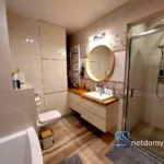 Na piętrze zaplanowano wygodne, ustawne sypialnie (część z oknami połaciowymi) i dużą, elegancką łazienkę – jest tu i prysznic typu walk-in, i wanna, a także dużo zabudów na wymiar. Osobne WC przy sypialniach to spory atut. Komunikację między kondygnacjami zapewniają solidne, drewniane schody i szeroki, doświetlony korytarz. W pokojach przewidziano pojemne szafy oraz miejsce do pracy. Całość wykończona spójnie: drzwi i podłogi z ciepłego drewna, nowoczesne oprawy oświetleniowe oraz neutralne, jasne kolory ścian. Co ważne, dom jest ekonomiczny w utrzymaniu, a kominek pozwala dodatkowo obniżyć koszty ogrzewania.