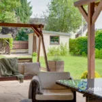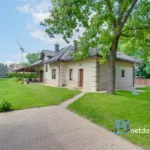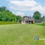 Dom wzniesiono w technologii tradycyjnej z pustaka ceramicznego MAX, ocieplono wełną mineralną 14–16 cm i wykończono płytką elewacyjną oraz tynkiem mineralnym. Zadaszony taras oraz trakty wokół domu wykonano z kamienia – trwałe materiały świetnie komponują się z zielenią. Działka o powierzchni 1544 m² została starannie zagospodarowana, a system automatycznego nawadniania ułatwia pielęgnację ogrodu. Układ posesji zapewnia prywatność, jednocześnie oferując wygodny dojazd i dodatkową przestrzeń do parkowania na podjeździe.