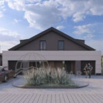 Na parterze zaprojektowano otwartą strefę dzienną: jasny salon z miejscem na kominek płynnie łączy się z przestrzenią kuchenną i jadalnią. Przesuwne, trzyszybowe okna otwierają dom na prywatny ogródek o powierzchni ok. 380 m² – idealny na rodzinne spotkania, zielnik czy plac zabaw. Na tym poziomie znajdziesz też pierwszą łazienkę oraz pomieszczenie gospodarcze z wyjściem na podjazd.