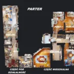 Na parterze część mieszkalna obejmuje 4 pokoje, w pełni wyposażoną kuchnię, łazienkę, WC, hol oraz wiatrołap.