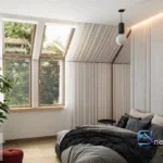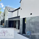 Na piętrze znajdują się trzy ustawne sypialnie oraz dwie łazienki, co znakomicie sprawdza się w rodzinnym użytkowaniu i przy gościach. Dodatkową zaletą jest czytelna komunikacja oraz duże przeszklenia, które zapewniają doświetlenie o każdej porze dnia. Bryła budynku łączy ponadczasową elewację z kamieniem naturalnym i deską z dużymi przeszkleniami w technologii HS – całość prezentuje się nowocześnie i elegancko.