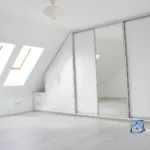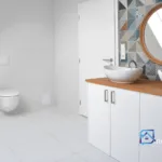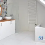 Na górze zaplanowano wygodne sypialnie z oknami połaciowymi i dużą zabudową szaf. Co więcej, sercem piętra jest duża łazienka: są tu dwie umywalki na długim blacie, prysznic walk-in, osobna wanna, a także WC podwieszane i bidet. Charakteru dodaje ściana z geometrycznymi płytkami i okrągłe lustro. W całym domu widać spójny, jasny styl, który łatwo dopasować do własnych mebli.
