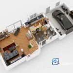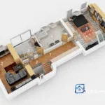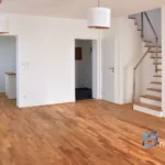 Parter tworzy jasna, otwarta strefa dzienna: przestronny salon z wyjściem na ogród płynnie łączy się z jadalnią. Tuż obok znajduje się wygodna kuchnia w zabudowie – z płytą gazową, piekarnikiem i drewnianymi blatami. Dalej mamy praktyczny wiatrołap, spiżarnię, pomieszczenie gospodarcze/kotłownię oraz garaż jednostanowiskowy z bramą segmentową. Drewniane schody z metalową balustradą prowadzą na poddasze.