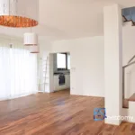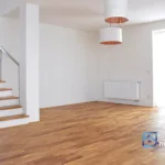 Okna w ciepłym kolorze drewna, grzejniki panelowe oraz drabinka w łazience. Podłogi na parterze i w kuchni to naturalne deski/parkiet, co ociepla przestrzeń. Dom jest gotowy do wprowadzenia – wystarczy dołożyć swoje dodatki i… już.