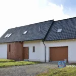 Nowoczesny, wolnostojący dom z użytkowym poddaszem i garażem w bryle. Elewacja jest jasna z eleganckimi, drewnianymi wstawkami, a dach pokryto czarną dachówką. Od ogrodu widać duże przesuwne okno tarasowe oraz delikatne wzniesienie terenu – dzięki temu salon i taras mają przyjemną ekspozycję i prywatność. Działka jest szeroka, zielona i łatwa do zagospodarowania; po bokach nasadzone są tuje.