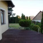 - Parter: Przestronny salon z wyjściem na taras, kuchnia z jadalnią, łazienka oraz pomieszczenie gospodarcze. Taras wyłożony drewnem idealnie nadaje się na relaks z widokiem na ogród.