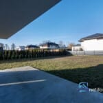 Działka jest w pełni uzbrojona: prąd, gaz, woda, kanalizacja. Ogrodzenie z paneli stalowych, podjazd wyłożony kostką, teren płaski – gotowy do dowolnej aranżacji ogrodu. Z tyłu budynku dużo przestrzeni – idealne miejsce na taras, trawnik, warzywnik albo plac zabaw dla dzieci.