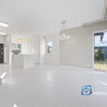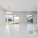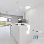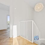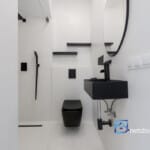 Parter budynku składa się z jasnego i przestronnego salonu połączonego z kuchnią, z którego przez duże przesuwne okno wychodzimy na zadaszony taras oraz ogród. Kuchnia została zaprojektowana z myślą o funkcjonalności – wyposażona w wysokiej klasy zabudowę na wymiar, z miejscem na wyspę i dużą ilością blatów roboczych. Na tym poziomie znajduje się również łazienka z prysznicem, przedsionek z szafą wnękową oraz komunikacja prowadząca do garażu.