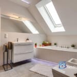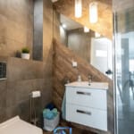 🛁 Dom posiada dwie komfortowe łazienki. Jedna z nich, zlokalizowana na parterze, urządzona została w ciepłych odcieniach drewna i kamienia – z kabiną prysznicową typu walk-in i designerską armaturą. Druga, na piętrze, to strefa relaksu – duża wanna pod oknem dachowym, elegancka ceramika, podświetlenie LED przy lustrze i miejsce na kosmetyki – idealna przestrzeń do odpoczynku po ciężkim dniu.