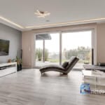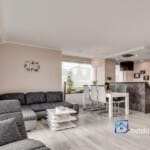 🛋 Wnętrze domu to prawdziwa perełka. Salon połączony z kuchnią i jadalnią tworzy przestrzeń otwartą, jasną i przyjazną. Duże przesuwne okna prowadzące na taras zapewniają doskonałe doświetlenie oraz widok na ogród. Na podłodze elegancka, jasna deska – łatwa w utrzymaniu i świetnie komponująca się z nowoczesnymi meblami. Wygodna, modułowa sofa, klimatyczne oświetlenie LED w podwieszanym suficie oraz ściana TV sprawiają, że aż chce się tu usiąść z kubkiem kawy.