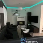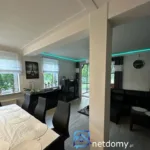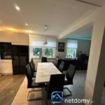 Dom wyróżnia się funkcjonalnym układem pomieszczeń. Na parterze znajduje się przestronny salon połączony z jadalnią i otwartą kuchnią, wyposażoną w meble na wymiar w białym połysku oraz kompletny sprzęt AGD. W salonie zainstalowano kominek z płaszczem wodnym, który dodaje wnętrzu klimatu. Jadalnia z dużym drewnianym stołem idealnie sprawdzi się podczas rodzinnych spotkań. Na tym poziomie znajduje się także słoneczny pokój z wyjściem na taras – idealny na biuro, gabinet lub pokój gościnny.
