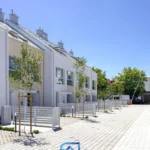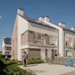 Wysokie przeszklenia zapewniają doskonałe doświetlenie wnętrz przez cały dzień, a wyjście z salonu prowadzi bezpośrednio do prywatnego ogródka o powierzchni około 25 m² – idealnego miejsca na poranną kawę lub zabawę dzieci. Dodatkową powierzchnię rekreacyjną stanowi zielony pas osiedlowy, który odgradza inwestycję od ruchu samochodowego, gwarantując ciszę i bezpieczeństwo.