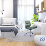 - Parter – ponad 34 m² salon z aneksem kuchennym i wyjściem na 130‑metrowy taras, łazienka, wiatrołap oraz jednostanowiskowy garaż z bramą segmentową.