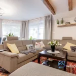 Rozkład pomieszczeń sprzyja codziennej wygodzie. Na parterze mieści się reprezentacyjna strefa dzienna z salonem ok. 33 m² z kominkiem, jadalnią, oddzielną kuchnią ze spiżarnią oraz łazienką. Wyjścia na tarasy i balkon pozwalają naturalnie łączyć wnętrze z ogrodem. Na piętrze zaprojektowano trzy ustawne sypialnie, dużą łazienkę i garderobę. Niski parter to samodzielne, dwupokojowe mieszkanie z kuchnią, łazienką i dodatkowym WC, a także część techniczna z kotłownią i praktyczną sauną – idealne miejsce na relaks po intensywnym dniu.