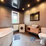 Układ pomieszczeń sprzyja wygodzie mieszkańców. Na parterze zaplanowano dwa pokoje, kuchnię oraz łazienkę z wanną i WC. Piętro oferuje trzy niezależne pokoje, kolejną kuchnię oraz drugą łazienkę z prysznicem i WC – rozwiązanie idealne dla rodziny wielopokoleniowej lub pod wynajem. Pełne podpiwniczenie zwiększa funkcjonalność – to idealne miejsce na pralnię, magazyn, warsztat czy domową siłownię.