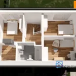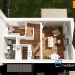 Parter to dzienna strefa rodziny: salon z wyjściem do ogrodu, aneks kuchenny z miejscem na duży stół, praktyczna spiżarnia pod schodami, gabinet/sypialnia oraz łazienka z miejscem na prysznic i pralkę. Na poddaszu przewidziano trzy ustawne sypialnie, garderobę/pralnię i drugą łazienkę (wanna lub prysznic). Wylane, betonowe schody na piętro ułatwiają dalsze prace wykończeniowe. Układ funkcjonalny jest przemyślany i zapewnia wygodną przestrzeń dla 3–5 osób.
