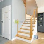 Na parterze znajduje się wiatrołap, przestronny salon z jadalnią (39,8 m²) i dostępem do zielonego ogródka, otwarta kuchnia (9,3 m²) oraz wygodne WC. Piętro oferuje trzy ustawne sypialnie (16,7 m², 16,6 m², 9,3 m²), duży korytarz i łazienkę z kabiną (6,9 m²). Dodatkowo na poziomie piętra wydzielono pomieszczenie pod gabinet lub drugą łazienkę, a zaadaptowana garderoba zwiększa funkcjonalność przestrzeni.