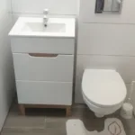 Na parterze (ok. 35 m²) mieści się jasny salon z aneksem kuchennym i bezpośrednim wyjściem na taras, dzięki czemu latem salon płynnie łączy się z ogrodem. Obok znajduje się elegancka łazienka z prysznicem. Na piętrze zaprojektowano trzy ustawne sypialnie (21, 14 i 12 m²) oraz dodatkowe WC. W całym domu na podłogach położono panele, a ściany wykończono gładzią, co pozwala na dowolną aranżację kolorystyczną.